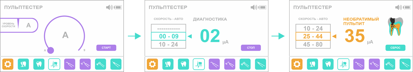 - Диапазон «диагностического» тока в режиме ПУЛЬПТЕСТЕР : от 0 до 80 мкА (шаг 1 мкА)