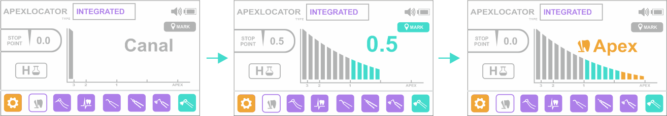 - Функция «Установка метки», позволяющая в процессе измерения рабочей длины отмечать зоны искривления канала или зоны остановки инструмента для более прогнозируемого процесса пломбирования канала